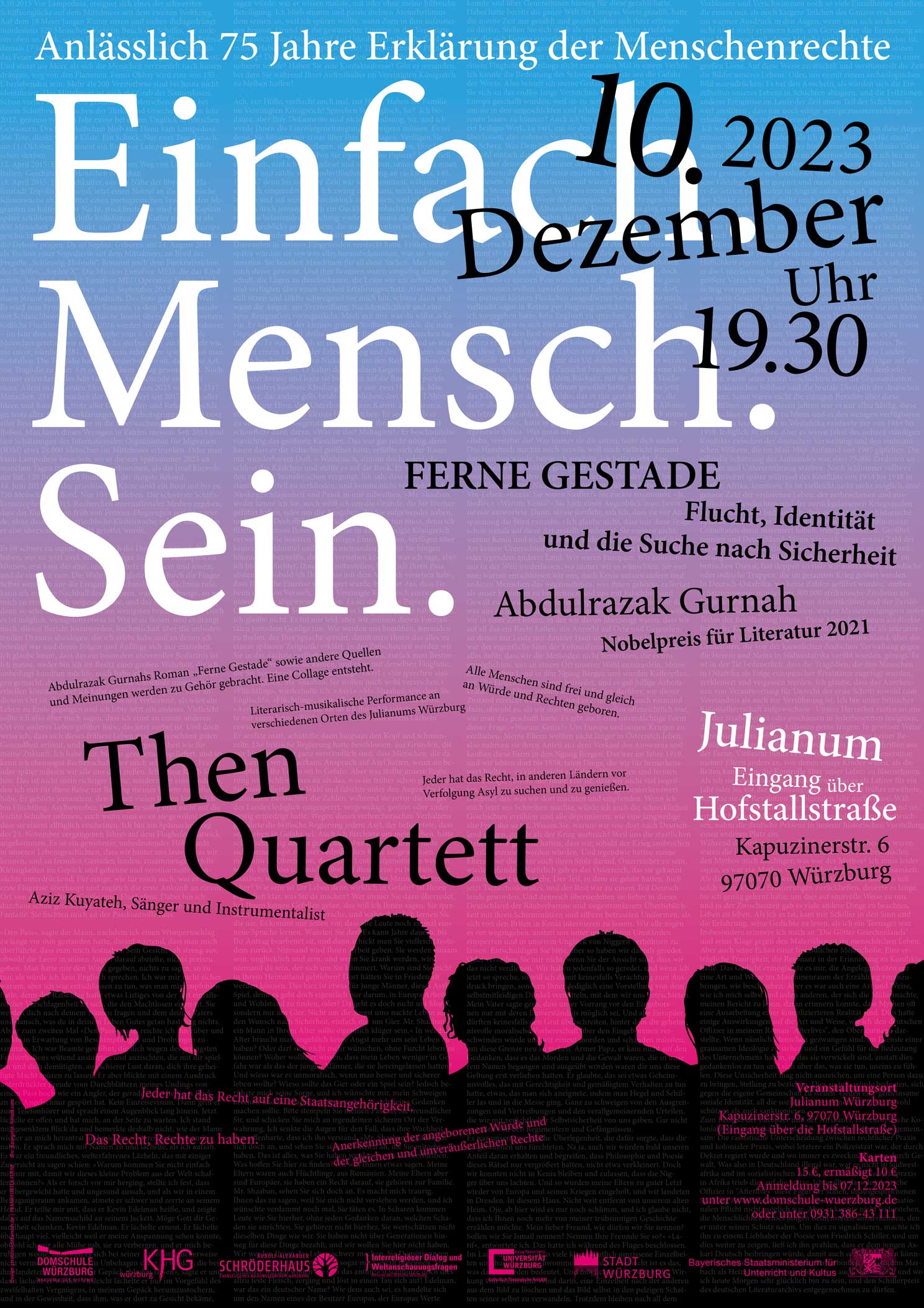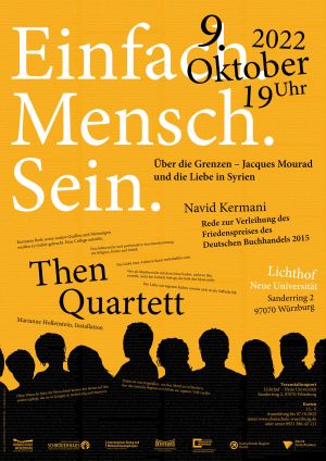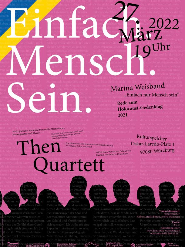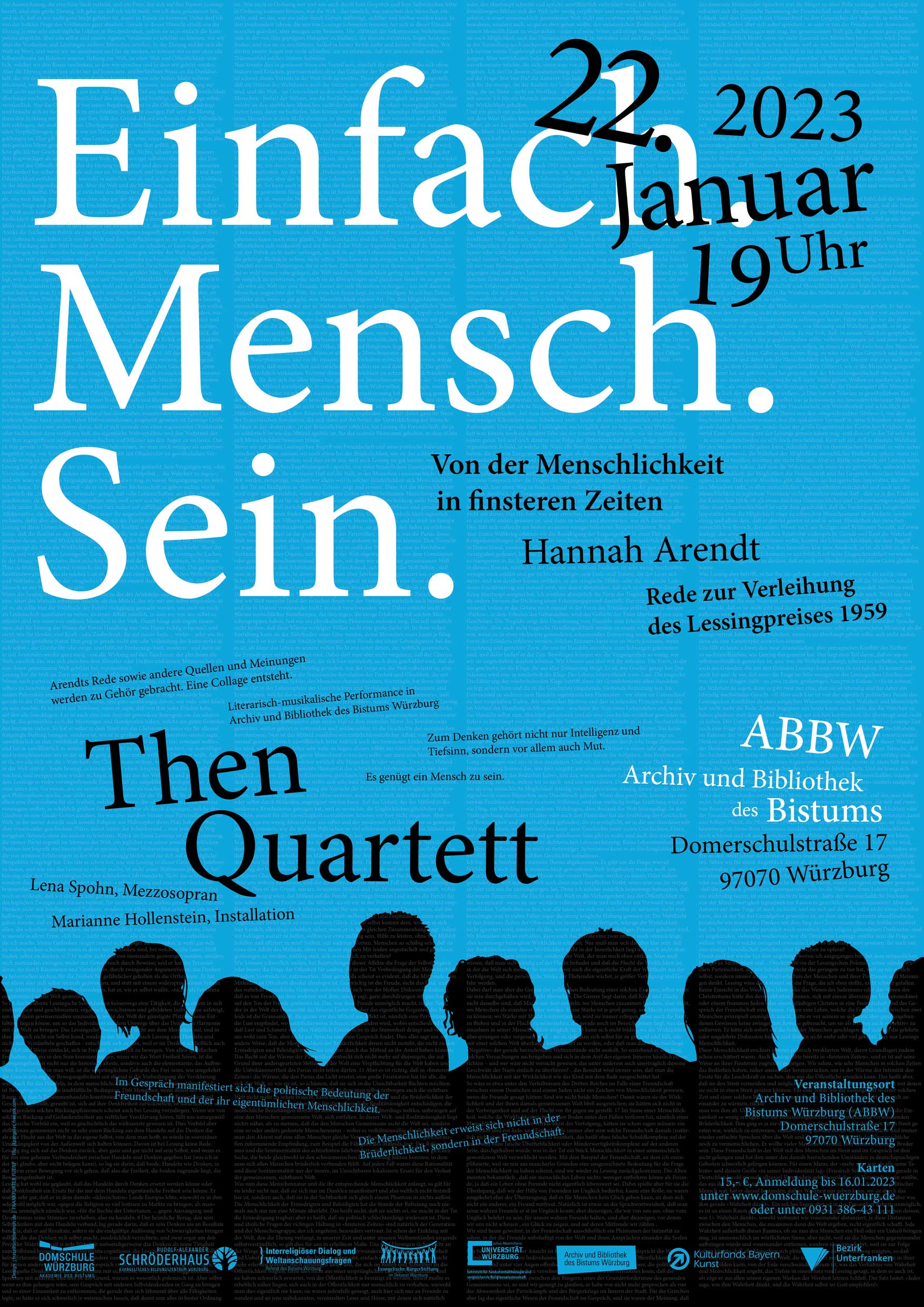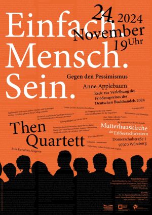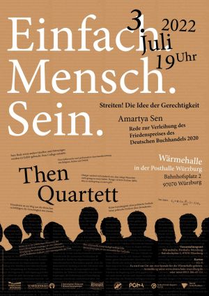 Im Mittelpunkt steht eine eine Rede mit dem Fokus auf das Menschsein. Sie wird künstlerisch-performativ vorgetragen vom Then-Quartett. Andere Künstler*innen kommen dazu. Der Veranstaltungsort steht in Verbindung mit dem Thema. Then-Quartett und Domschule stehen für das Konzept und laden zur Kooperation.