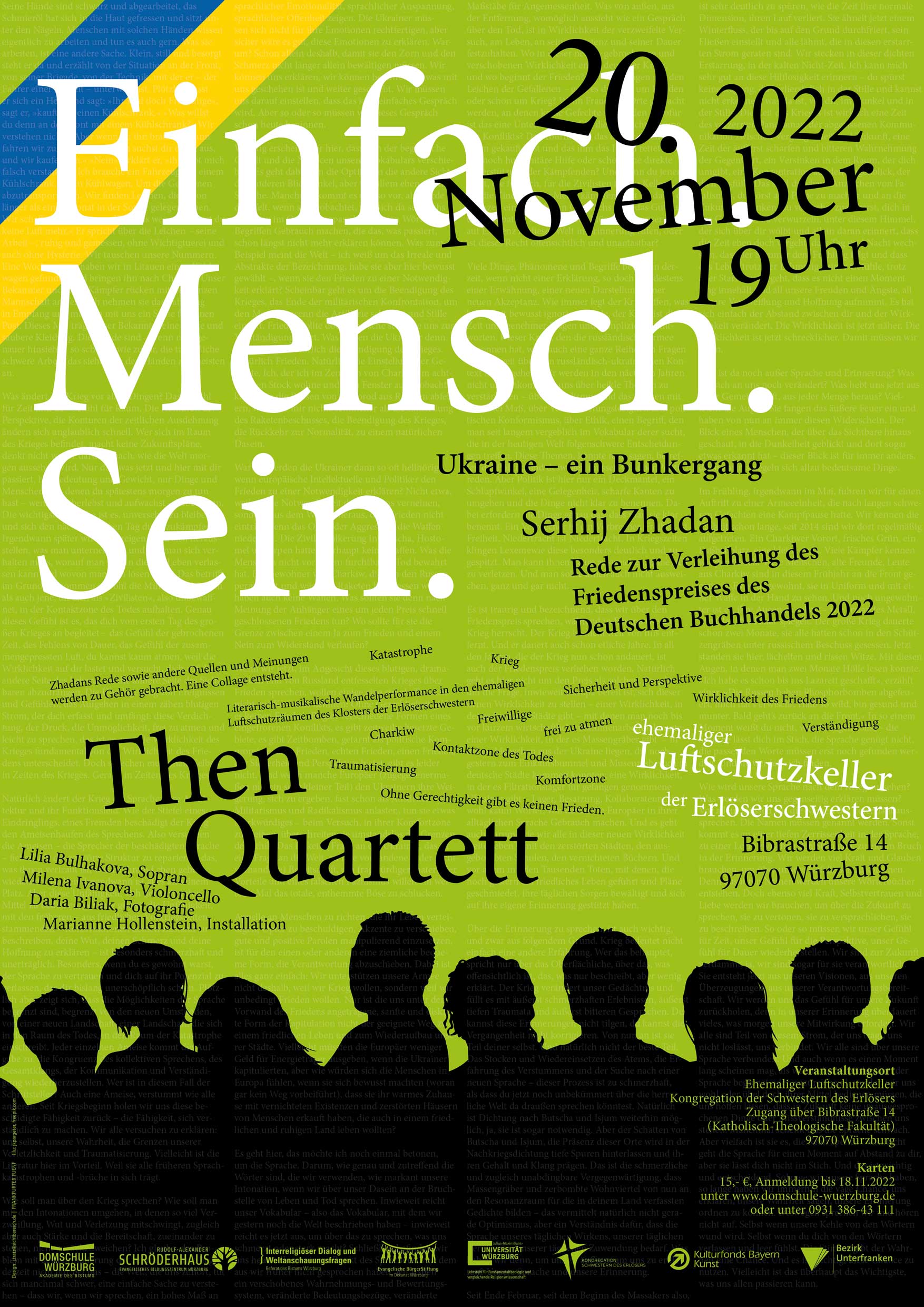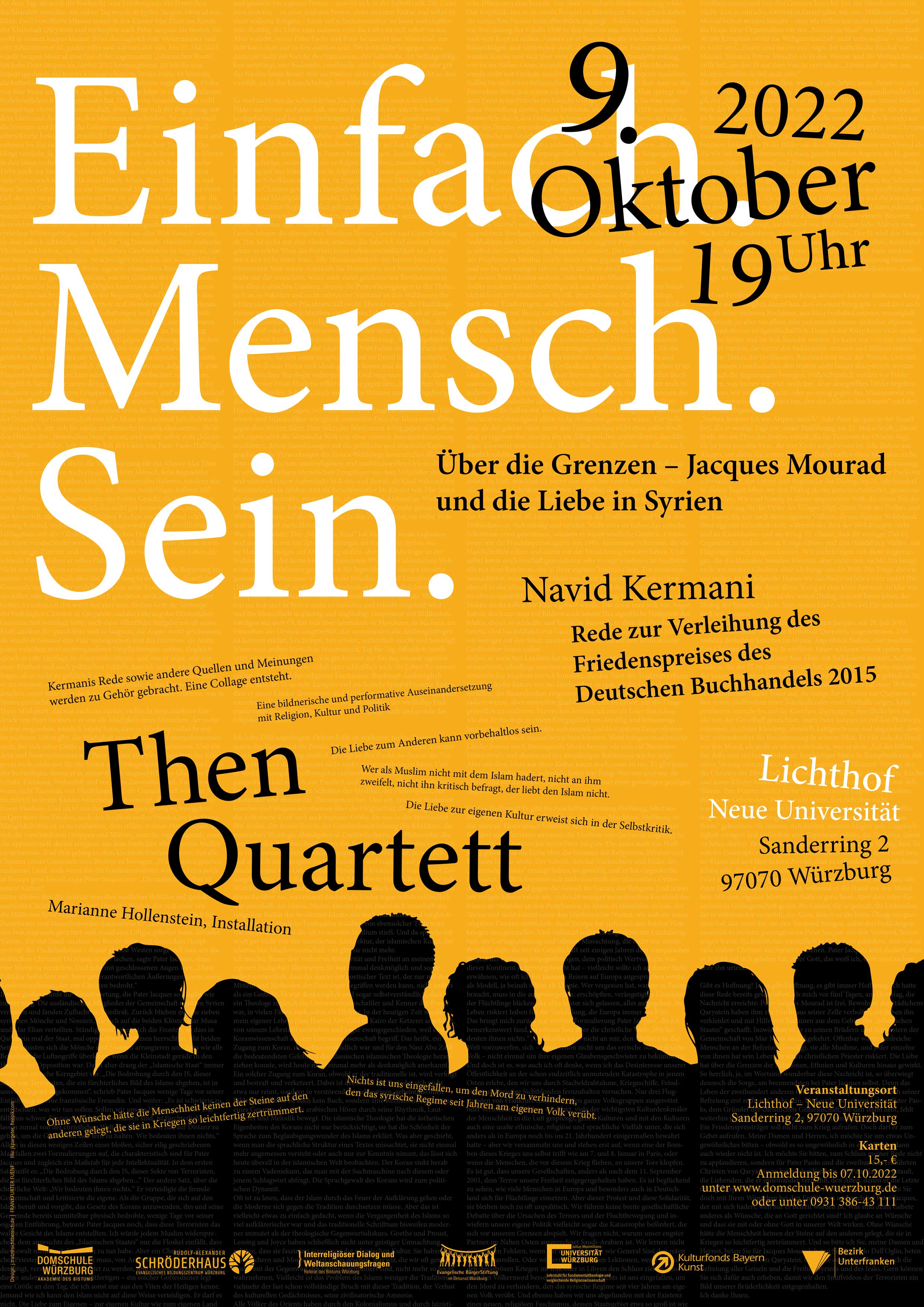 Im Fokus steht jeweils eine historische oder aktuelle Rede zum Menschsein. Das Then-Quartett und weitere Künstler*innen tragen sie künstlerisch-performativ vor. Das Konzept verantworten Then-Quartett und Domschule Würzburg gemeinsam. Der Titel der Reihe stammt aus Marina Weisbands Rede im Bundestag am Holocaust-Gedenktag 2021. Sie endet mit dem Wunsch „Einfach nur Mensch sein“.